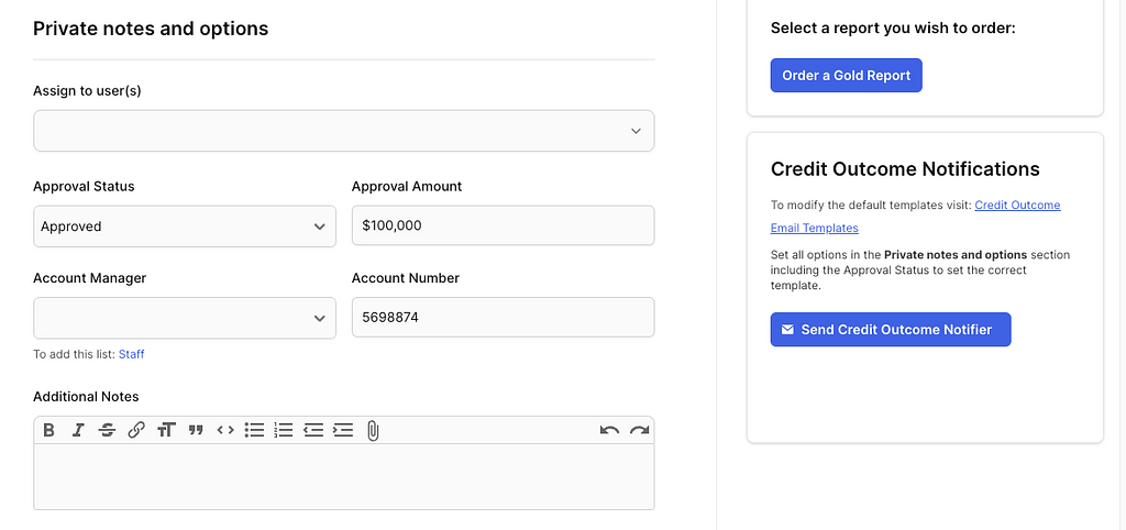 In your application's dashboard, you can assign an Approval Status, Approval Amount, Account Manager, and Account Number. Depending on the placeholders you have put in, this information will automatically populate the email template.